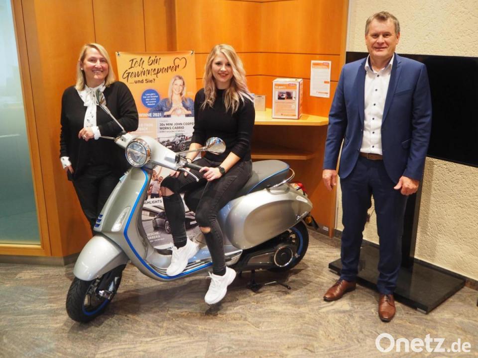 Über einen Elektroroller der Marke Vespa Electtrica im Wert von 6400 Euro freute sich nun Renate Brütting aus Metzlasreuth bei der Verlosung des Gewinnsparvereins Bayern. Übergeben wurde das Zweirad in den Räumen der Raiffeisenbank in Schlammersdorf stellvertretend an Tochter Sandra Brütting. Geschäftsstellenleiter Manfred Eller und Privatkunden-Beraterin Regina König von der Volksbank Raiffeisenbank Nordoberpfalz eG freuten sich ganz besonders für die gebürtige Schlammersdorferin, weil sie bereits seit 35 Jahren eine treue Gewinnsparerin ist.