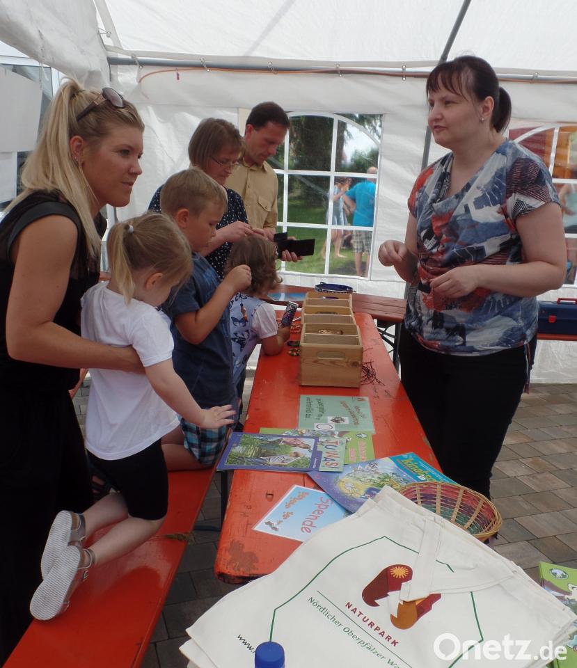 Nicht minder groß war das Interesse der Festbesucher am Info- und Erlebnisstand des Naturparks Nördlicher Oberpfälzer Wald vor dem Bürgerhaus. Das Angebot, Naturpark-Glückskettchen selbst anzufertigen, wurde mit Begeisterung angenommen.