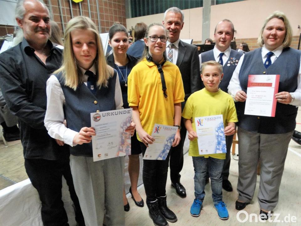 Für erfolgreich abgelegte Prüfungen bekamen sie das entsprechende Leistungsabzeichen. Stellvertretender Bezirks- und Kreisdirigent Gerhard Böller überreichte zusammen mit Vorsitzendem Harald Lukesch das Juniorabzeichen an Alexa Schobel und Benedikt Liebenow auf Saxofon beziehungsweise Schlagzeug. Das D 1-Leistungsabzeichen in Bronze konnten sie an Marica Kramme (Querflöte) verleihen.