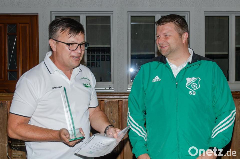 In konstruktiver und vertrauensvoller Zusammenarbeit mit der Vereinsführung habe dieser 2016 beim 1. FC Schlicht einen Neubeginn mit jungen Spielern begonnen. Zunächst habe das Team die Kreisklasse sicher gehalten, dann im Vorjahr überlegen die Meisterschaft errungen und nun, was in der Vereinsgeschichte noch nicht gelungen sei, sich in der Kreisliga behauptet. Einerseits verabschiede man den Meistertrainer nur schweren Herzens, andererseits sei man vor allem froh darüber, dass Stephan Braun im Verein weiterarbeiten und künftig als sportlicher Leiter seine fachliche Kompetenz in die Fortentwicklung der Herrenteams mit einbringen werde. Als Dank und Anerkennung überreichte der Vorsitzende an den Erfolgstrainer einen gravierten Glaspokal. Da Braun auch ein großer Fan des 1. FC Nürnberg ist, bekam er ferner einen Gutschein für Eintrittskarten für Spiele des Clubs.