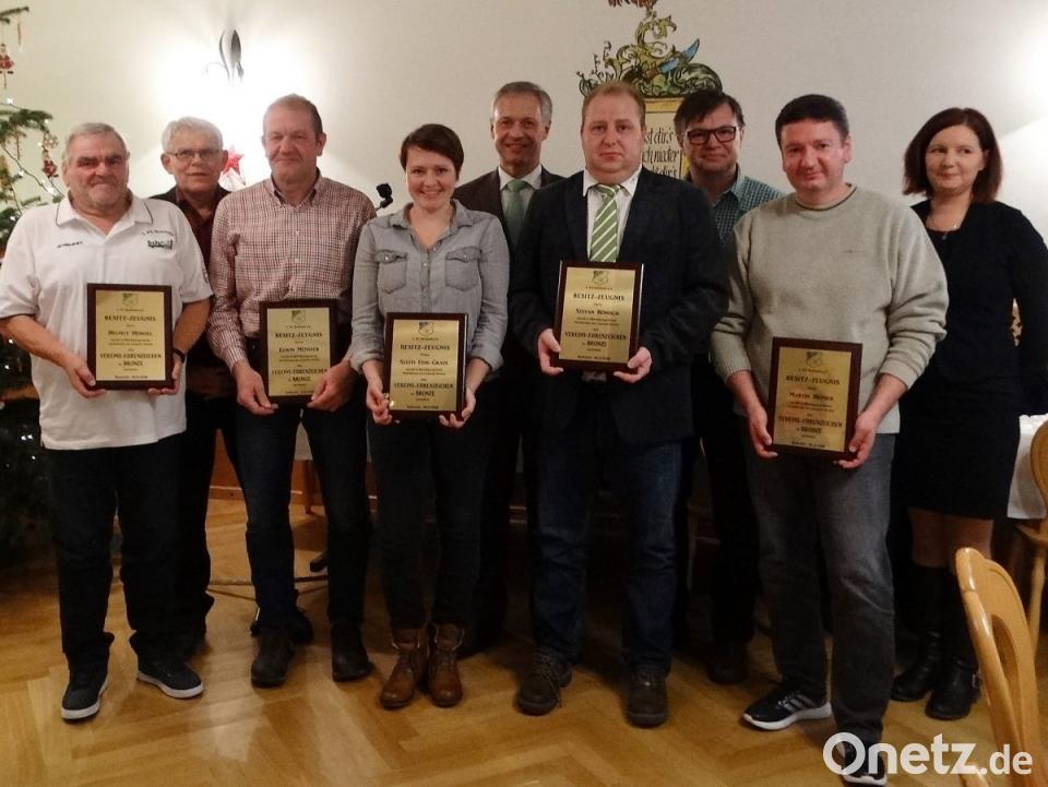 Mit dem Vereinsehrenzeichen in Bronze werden bedacht: Helmut Heinzel (vorne von links), Edwin Münster, Stefanie Fink-Gradl, Stefan Bönisch und Martin Hefner. Laudator (von hinten links) Christian Trummer, Bürgermeister Thorsten Grädler, Vorstand Stefan Weiß und Schriftführerin Elisabeth Grosser.