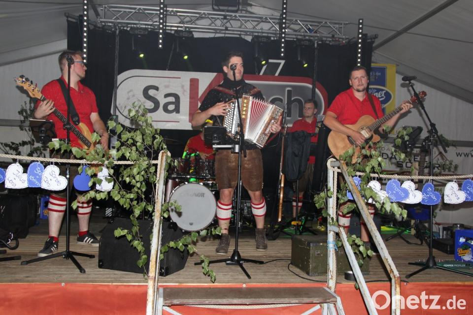 Nach dem Gottesdienst gab es ein Standkonzert der Trischinger Blasmusik auf dem Kirchplatz. Diese führte im Anschluss den Zug zum Festzelt an. Dort angekommen, spielten die Trischinger noch einmal auf, bevor die Musikband „SaKrisch“ das musikalische Zepter übernahm. Das Festzelt füllte sich rasch, und auch in der Bar war wieder einiges los.
