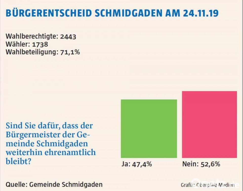 Die Gemeinde Schmidgaden bekommt ab der kommenden Wahlperiode einen hauptamtlichen Bürgermeister. Dieses Ergebnis brachte am Sonntag der Bürgerentscheid.