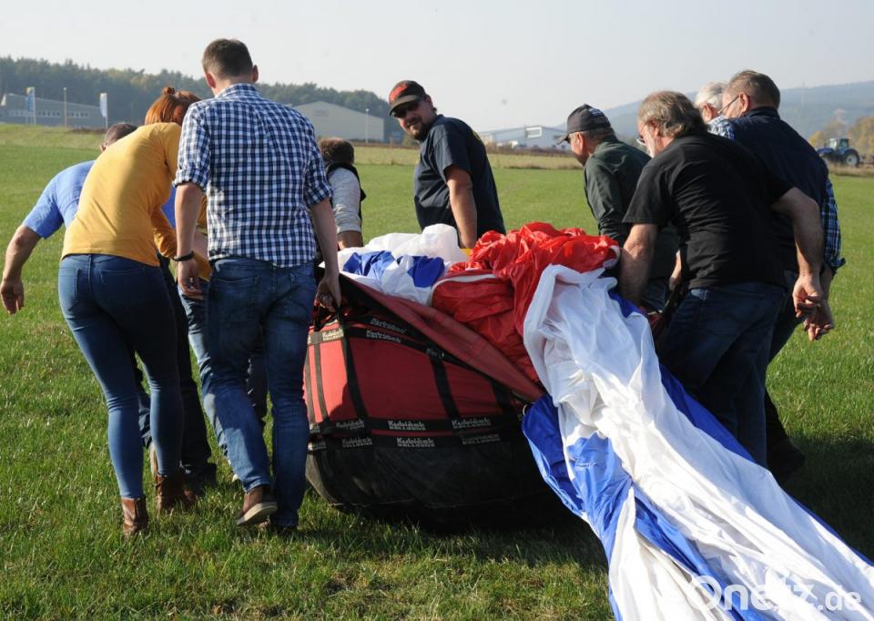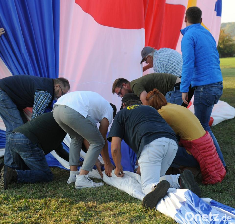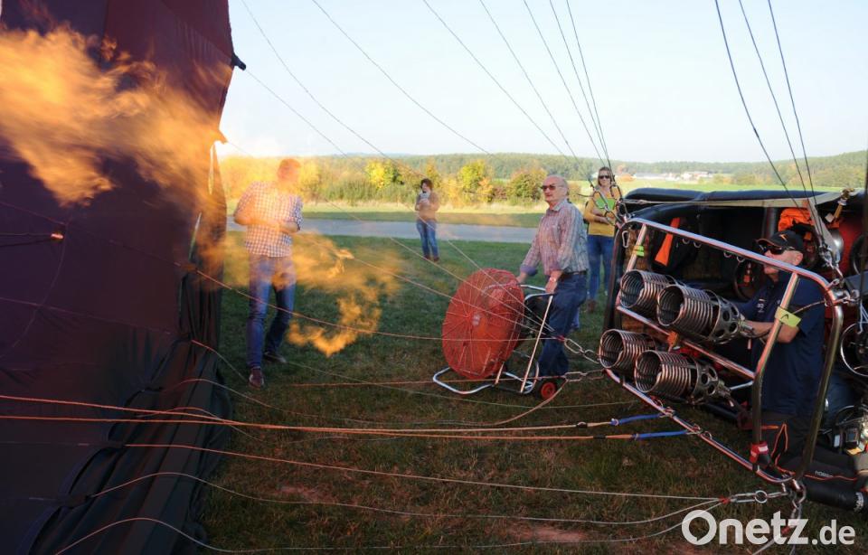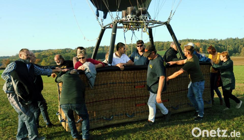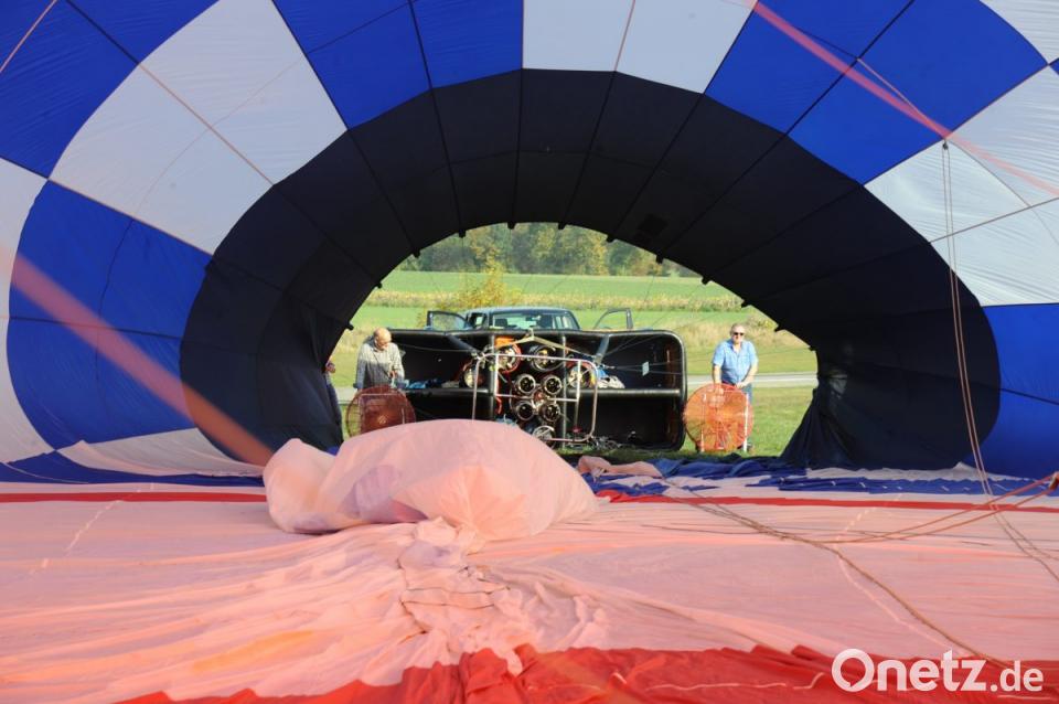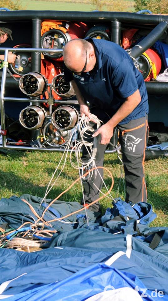 Alle müssen mithelfen, den Korb vom Hänger zu heben und die Ballonhülle als gut 60 Meter langen Schlauch aus dem Transportsack zu ziehen. Zwei leistungsstarke Ventilatoren blasen binnen weniger Minuten den Ballon mit Kaltluft auf, die dann mit den Gasbrennern erhitzt wird. Der Ballon stellt sich langsam in seiner gesamten Größe auf. Alle steigen ein. Dann kommt sofort der Hinweis auf die Landung, „bei der wir uns mit dem Rücken zur Fahrtrichtung an den Halteschlaufen festhalten und in die Hocke gehen“, was nach gut einer Stunde Fahrt perfekt funktioniert.