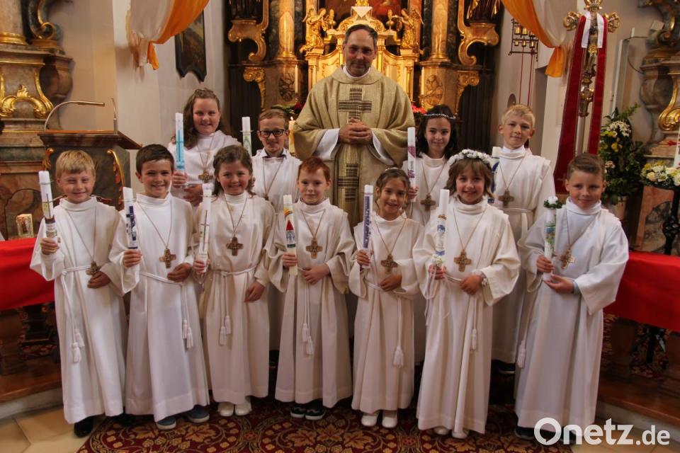 Am Sonntagvormittag war es nun soweit. Die elf Kinder trafen sich vor dem Gottesdienst an der Grundschule. Dort wurden sie von Pfarrer Gerhard Wagner abgeholt und in die festlich geschmückte Pfarrkirche geleitet. Dort zelebrierte der Geistliche den Festgottesdienst. Er wurde musikalisch von der Gruppe "Sound of Spirit" gestaltet.