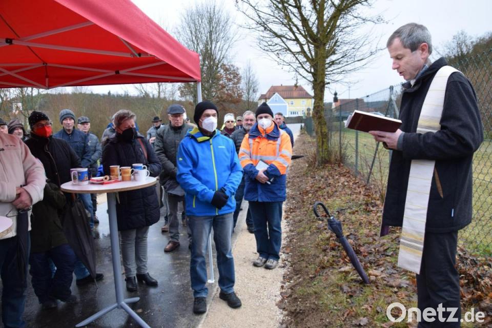 Zusammen mit Bürgermeister Peter Braun durchschnitten Landrat Richard Reisinger, Landtagsabgeordneter Harald Schwartz sowie Bauoberrat Stefan Noll und Straßenbau-Bereichsleiter Tobias Bäumler, beide vom Staatlichen Bauamt Amberg-Sulzbach, das rote Band als symbolische Freigabe des ausgebauten Radweges. Doch vor dem „Scherenschnitt“ bat Pfarrer Werner Sulzer um eine allzeit unfallfreie Fahrt auf dem Radweg.