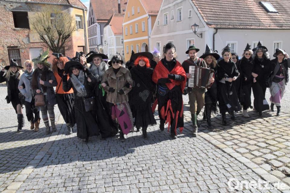 Knapp 50 Hexen - mit spitzem Hut und weitem Rock, drei Pullovern darunter, mit wilder Mähne, schwarzen Zähnen und grünen Gesichtern - waren in Schmidmühlen unterwegs. Sie tanzten auf den Straßen, sangen, schunkelten und jagten auch mal einem Mann hinterher, der sich recht tollpatschig postiert hatte - wie seit 52 Jahren am g´schmalzenen Freitag.