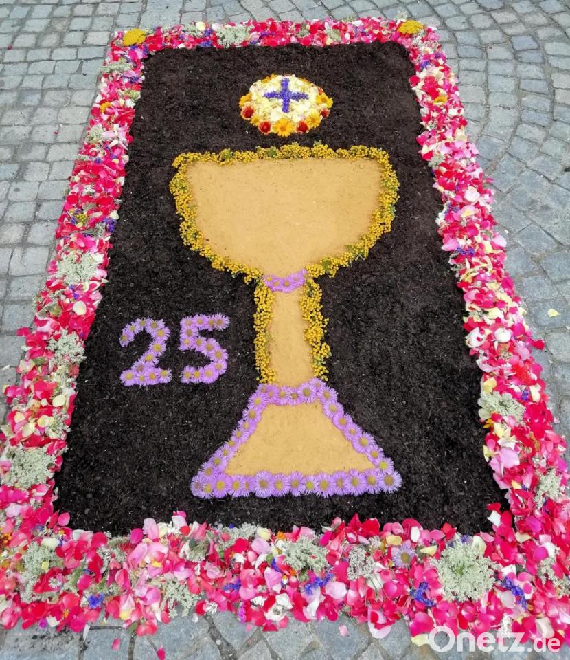Mit einem kräftigen Applaus dankten die Kirchbesucher Pfarrer Werner Sulzer. Im Anschluss an den Festlichen Gottesdienst gab es einen Stehempfang am Kirchplatz. Die Besucher wurden zu einem Glas Sekt eingeladen und die Blaskapelle St. Ägidius gab ein Standkonzert. Natürlich musste Pfarrer Werner Sulzer auch bei einem Marsch mit dem Dirigentenstab den Takt angeben. Anlässlich des 25-jährigen Priesterjubiläums hatte die Kolpingfamilie einen Blumenteppich am Kirchplatz angefertigt. Viele Schmidmühlner nutzten die Gelegenheit, um ihrem Pfarrer persönlich zu gratulieren.
