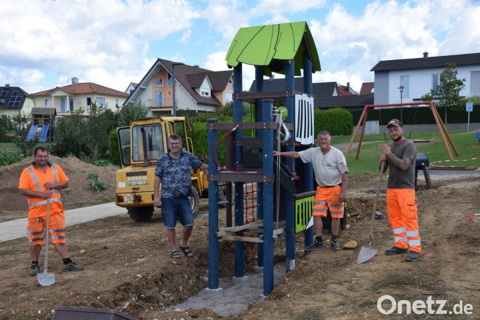 Etwa 30 000 Euro wird die Ausstattung des Kinderspielplatzes im neuen Wohnbaugebiet Ledererhang mit einer Umzäunung kosten, sagte Schmidmühlens Bürgermeister Peter Braun. „Erstmals werden in Schmidmühlen Spielgeräte aus recycelbaren Materialien verwendet. Hersteller ist Westfalia.“ Aufgebaut werden in diesen Tagen ein Kletterturm mit angebauter Rutsche und eine Sandkiste. Dazu kommen als Ergänzung ein Trampolin und ein Kletter-Pferd. Zur Ausstattung gehören noch einige kleinere Spielgeräte und auch eine Bank für Eltern und Erziehungsberechtigte zum Hinsetzen samt einem Abfalleimer, so wie es sich gehört.