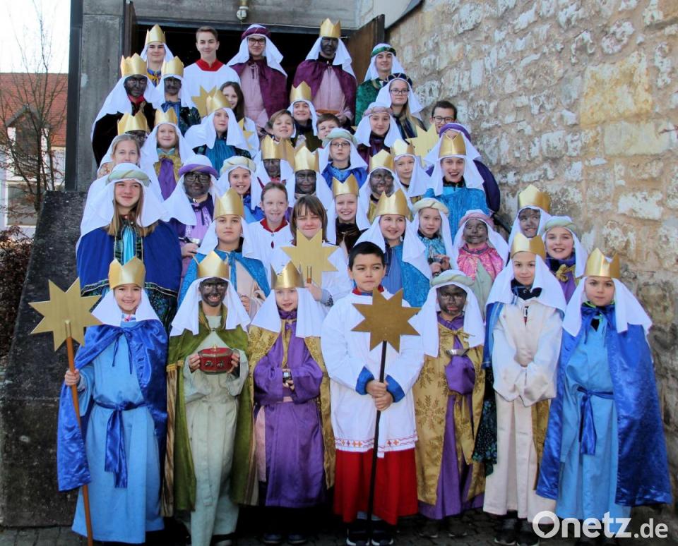 Die zwölf Sternsingergruppen, jeweils drei Kinder in den entsprechenden Gewändern der Heiligen Drei Könige und mit Weihrauchkessel, begleitet von einem Kind als Sternträger, zogen anschließend von Haus zu Haus und trugen ein Gedicht vor. Auf Wunsch schrieben sie über die Haustür die Buchstaben C, M, und B (Christus mansionem benedicat = Christus segne dieses Haus).