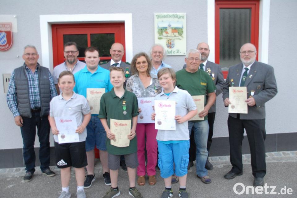 Durchwegs zufrieden können die Emhofer Vilstalschützen heuer sein. Bei den Rundenwettkämpfen des Schützengaus Burglengenfeld konnte man mit teils guten Ergebnissen aufwarten. So belegte die Mannschaft aufgelegt den zweiten Platz im Rundenwettkampf im Schützengau Burglengenfeld. Geehrt wurden an diesem Vereinsabend auch die Vereinsmeister. In diesen vereinsinternen Wettkämpfen treten die Schützen in den einzelnen Altersklassen an. Der Höhepunkt des Abends waren schließlich die sportlichen Ehrungen. Schützenmeister Theo Hummel nahm zusammen mit 3. Bürgermeister Martin Bauer die Ehrung der Vereinsmeister und die Königsproklamation vor. Schützenkönig wurde mit einem 36,0-Teiler Helmut Werner. Ihm stehen Theo Hummel (50,4) und Harald Scheuerer (124) als Ritter zur Seite. Die Würde der Schützenliesl errang Elli Meisinger (655,2 Teiler). Jugendkönig ist Markus Werner mit einem 42 Teiler vor Maurice Simon (95,3) und Louis Birner (209). Den Wanderpokal gewann Markus Werner mit einem 84-Teiler.