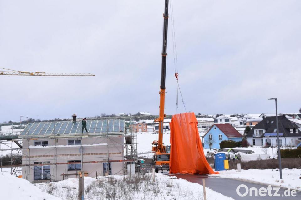 Das Wohnbaugebiet Ledererhang in Schmidmühlen ist trotz des Winters eine Großbaustelle. Autokräne sind derzeit dabei, Fertighäuser aufzustellen. Manchmal schaut es aus wie bei Christo, als er vor 25 Jahren in Berlin den Reichstag verhüllt hat. Doch hier geht es nicht um Kunst, die riesigen Planen schützen die Bauten vor Schnee und Regen.
