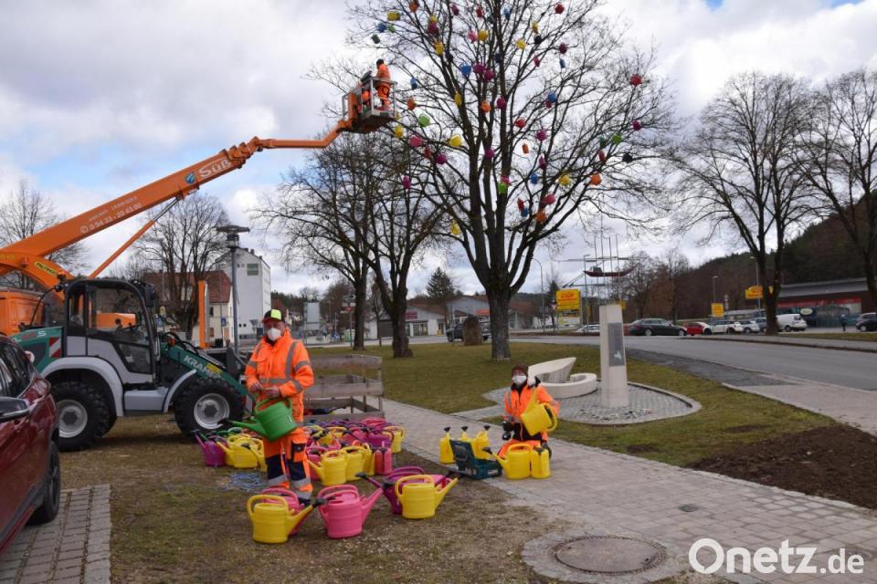 Trotz der nicht abnehmenden Pandemiewelle tut sich in Schmidmühlen etwas für Auge. Quasi mitten im Ausschlagen ist der Gießkannenbaum am Ortseingang direkt neben der Kunstwanderstation. Knapp 300 Gießkannen werden es heuer sein, die die Bauhofmitarbeiter an den Zweigen aufhängen. Leichtes Schneegestöber und ein schneidender Westwind konnten sie nicht daran hindern, den Gießkannenbaum zu schmücken. Jetzt sieht man die bunten Gießkannen in voller Pracht im Wind schaukeln, weil kein Blätterdach den freien Blick beeinträchtigt.