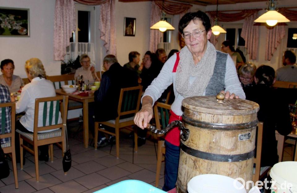 Erinnerungen an die „gute alte Zeit“ weckte der Gartenbauverein Schmidtstadt und Umgebung als er zum Ausbuttern Mitglieder und Freunde in das Café zum Res´n einlud. Rund 30 Personen folgten der Einladung, um wieder einmal den Genuss von frischer Butter auf Bauernbrot, Kartoffeln und Radieschen zu erleben. Um diese inzwischen zur Rarität gewordene Aktion verwirklichen zu können, kam das originale Butterfass der Familie Hans Wedel zum Einsatz. Elfriede Zäch drehte die Kurbel an dem mit frischen Rahm gefüllten Holzfass so lange, bis das Milchfett Klumpen bildete. Die Butterklumpen wurden dann in ein Buttermodel gepresst, womit die Butter eine rechteckige haushaltsübliche Form erhielt. Auf den verschiedenen Tischen verteilt, ließen sich die Gäste des Gartenbauvereins die frische Butter und die leckeren Zutaten schmecken. Als dazu passendes Getränk konnte die beim Ausrühren gewonnene Buttermilch verkostet werden.