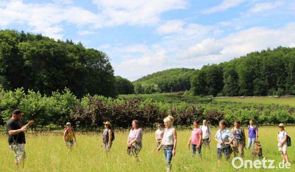 Sandra Maier verteilte an die Kinder Eierschachteln mit aufgeklebten Bildern von Gräsern, Blättern und Samen. Sie forderte die Kinder auf, die Originale zu suchen. Den Erwachsenen überreichte sie Gläser mit Feldfrüchten, zu denen sie unterwegs Passendes ergänzen sollten. Die Wanderung führte zu Anbauflächen von Lein, Linsen und Nackthafer. Außerdem steuerte die Wandergruppe die Haselnuss-Plantage der Familie Zäch an: sechs Hektar groß und mit 3000 Bäumen von zwei verschiedenen Haselnuss-Arten. Hans Zäch erklärte die Besonderheiten der Haselnuss, die Einflüsse der Witterung und des Schädlingsbefalls auf den Ertrag sowie Ernte und Vermarktung für die Produktion von Schokolade und Brotaufstrich. Sandra Maier leitete die Teilnehmer zum Kuh-Yoga an, um ihnen einen Ausgleich zur körperlichen Anstrengung bei der Tour zu bieten.