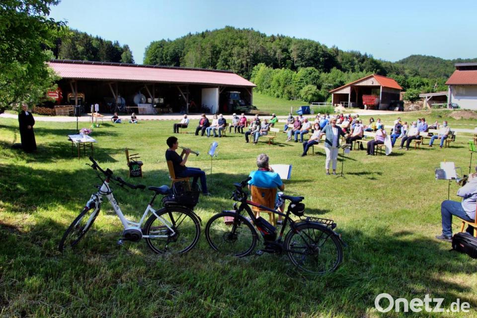 Die Wiese der Familien Appel diente am Pfingstmontag als Treffpunkt zum Gottesdienst. Pfarrer Markus Vedder predigte über das Pfingstwunder aus der Apostelgeschichte. Dabei stellte er fest, dass der Geist zwar unsichtbar und unhörbar ist, aber trotzdem vertrauen die Gläubigen auf den Lebensatem und die Lebenskraft. Erkennbar sei der Geist Gottes in der Natur, im Wachsen und Gedeihen. Am Beispiel von Pater Damian, der sich die Hilfe von Leprakranken zur Aufgabe gemacht hatte, empfahl der Geistliche: „Wir sollen Menschen für andere sein!“ Den Gottesdienst umrahmte ein Quintett des Posaunenchors Kirchenreinbach unter Leitung von Claudia Vogel.