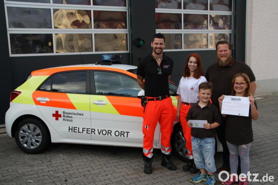 Für die Theatergruppe der Kolpingfamilie überreichten Jürgen Meier (rechts) und der Theaternachwuchs Rosalie und Vitus Meier eine Spende an Bereitschaftsleiter Johannes Sellmeyer (links). Jessica Oetter war bei der Spendenübergabe in Doppelfunktion dabei: als Mitglied des HvO-Teams und der Theatergruppe.