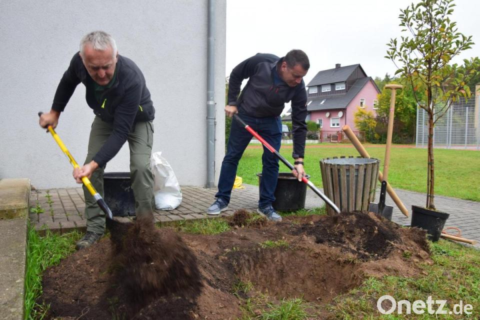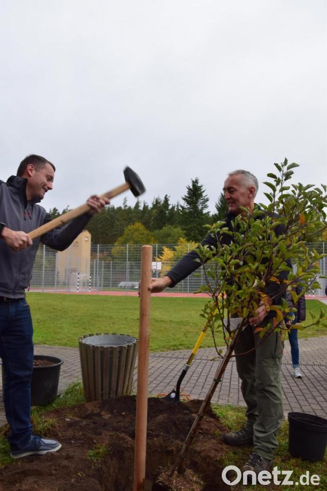 Ende Mai war die neue Sportanlage der Grund- und Mittelschule Schnaittenbach in Betrieb genommen werden. Das zuständige Landschaftsbauunternehmen Lobinger, vertreten durch Chef Alfons Lobinger, überreichte nun nachträglich sein grünes Präsent, einen Busch-Apfelbaum. Beim Pflanzen half Schnaittenbachs Zweiter Bürgermeister Uwe Bergmann kräftig mit und schaufelte unter den kritischen Augen einer kleinen Schülerdelegation gemeinsam mit Lobinger ein Loch für das hübsche Apelbäumchen.