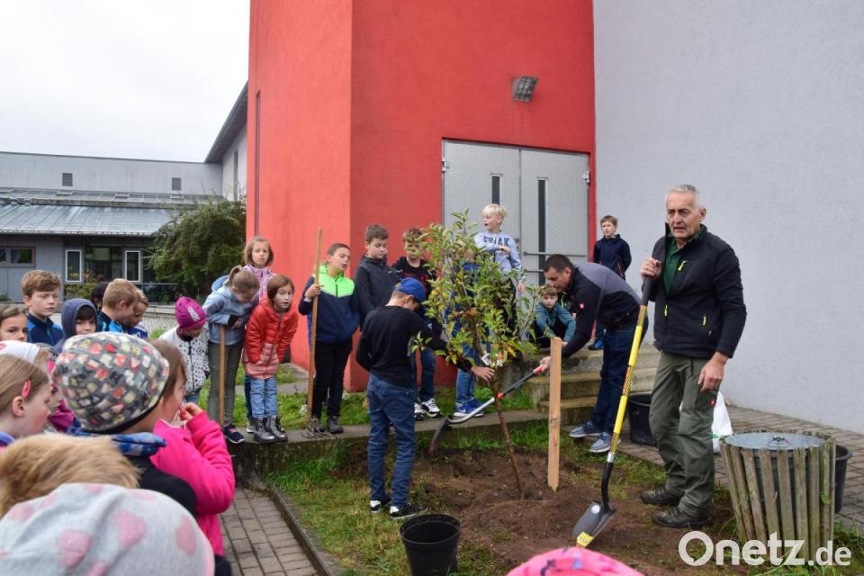 Nach kurzer Zeit stand das Bäumchen mit direktem Blick auf die Sportanlage sicher in bester Erde und wird mit etwas Glück bereits im nächsten Jahr Früchte tragen. Dann sind, so hoffen die Kinder, in dem bunten Obst keine Würmer, wie das eingangs die Chorklasse unter der Leitung von Sabine Weiß in ihrem Lied spitzbübisch orakelte.