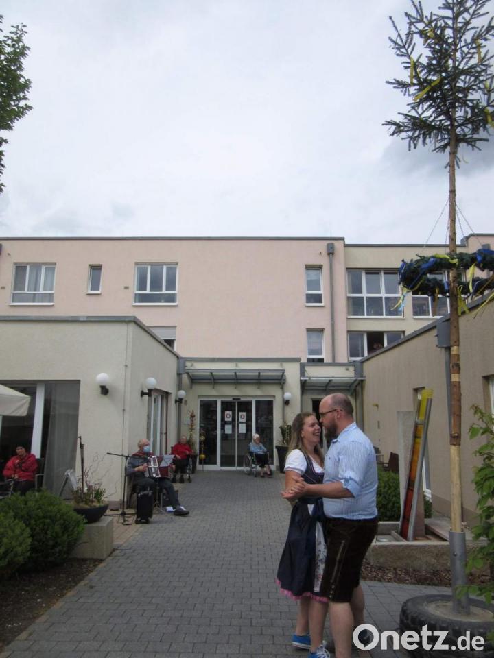 Der guten Stimmung der Heimbewohner tat das Einhalten der Hygiene- und Schutzbestimmungen keinen Abbruch. Dass dem so war, dafür sorgten mehrere externe Helfer, spendable Sponsoren und das Evergreen-Betreuungsteam mit seiner Chefin Sifa Heldmann. Besonders ins Zeug legten sich die Mitglieder des Schnoittenbecker Kirwavereins, allen voran der Zweite Vorsitzende Michael Ott. Er spendierte nicht nur den Maibaum, sondern transportierte diesen auf spektakuläre Weise – aufrecht stehend und fertig geschmückt – per Traktor auf das Heimgelände. Die Heimsenioren bestaunten live das Spektakel und quittierten es mit Beifall. Solchen erntete immer wieder auch Erwin Meier vom Heimat- und Volkstumsverein Ehenbachtaler. Er spielte mit seiner Ziehharmonika flott auf. Mit seinen bodenständigen Stücken traf er genau den Geschmack seines Publikums. Pflegedienstleiterin Kristina Schwendner und ihr Mann Dominik, Hauswirtschaftsleiter des Heimes, schwangen dazu sogar munter das Tanzbein.
