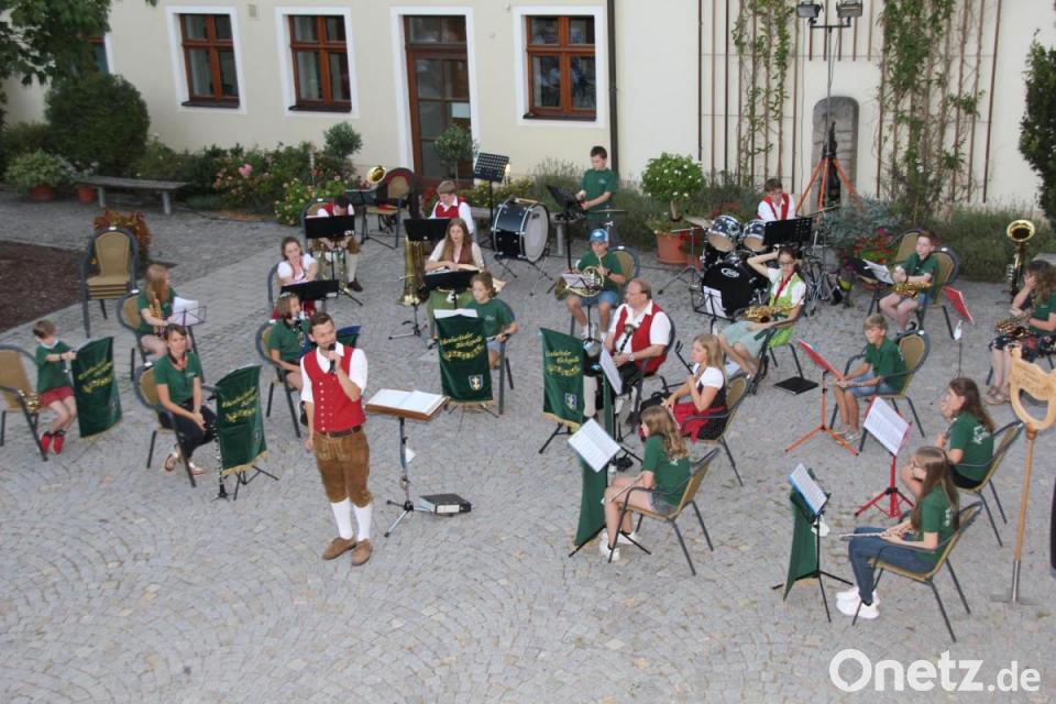 Ganz andere Klänge waren dann nach dem Ortswechsel im Rathausinnenhof beim Picknickkonzert zu hören, wo eine heitere Grundstimmung vorherrschte. Schnell waren alle Stühle besetzt. Den ersten Teil bestritten die Nachwuchsmusiker der Ehenbachtaler Blaskapelle unter dem Dirigat von Johannes Pilarski. Mit dem Stück „Hello“ begrüßte das Ensemble die Besucher und schaffte es, den Funken der Begeisterung für die Musik überspringen zu lassen. Der Aufforderung zum Mitklatschen kamen die Gäste gerne nach.