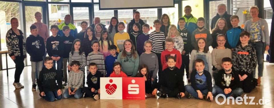 Die Viertklässler freuen sich mit ihren Lehrerinnen Sonja Gayk und Stefanie Ruoff (links) sowie Rektorin Michaela Bergmann (rechts), dass sie die Radfahrprüfung unter den gestrengen Blicken von Verkehrserzieher Harald Heselmann (hinten, Dritter von links) und Markus Neumeyer (hinten, Dritter von rechts) geschafft haben.