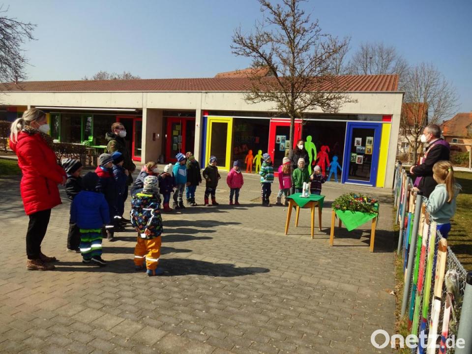 Damit auch die Mädchen und Buben, die den Kindergarten derzeit nicht besuchen, das Osterfest in der Einrichtung feuern können, hatte der Osterhase alle zu einem Treffen am Außengelände des Horts eingeladen. Da zu Ostern aber mehr gehört als der Besuch des Hasen, waren die Kinder, die täglich den Kindergarten besuchten, fleißig und hatten für alle Daheimgebliebenen Palmbuschen gebastelt. Auch die neuen Osterkerzen standen bereit. All diese Dinge segnete Herr Pfarrer Josef Irlbacher bei einem kurzen Besuch über den Gartenzaun hinweg.