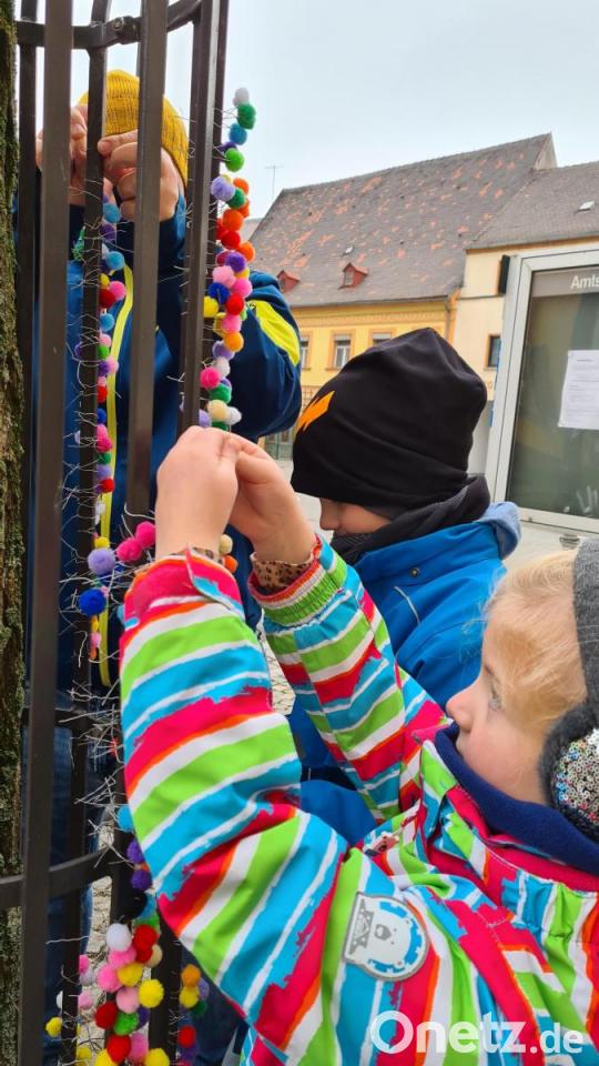 Mit Hilfe des Elternbeirats versah man 10 246 bunte Flauschbälle mit einem Draht, so dass die Kinder aus der Notgruppe die Bäume am Platz vor dem Schnaittenbacher Rathaus schmücken konnten. Doch damit nicht genug. Unter dem Motto "zamhalten" wurden Flyer an die Anwohner der B 14 verteilt mit der Bitte, sich an der Aktion zu beteiligen und die Fenster faschingsgemäß zu dekorieren.
