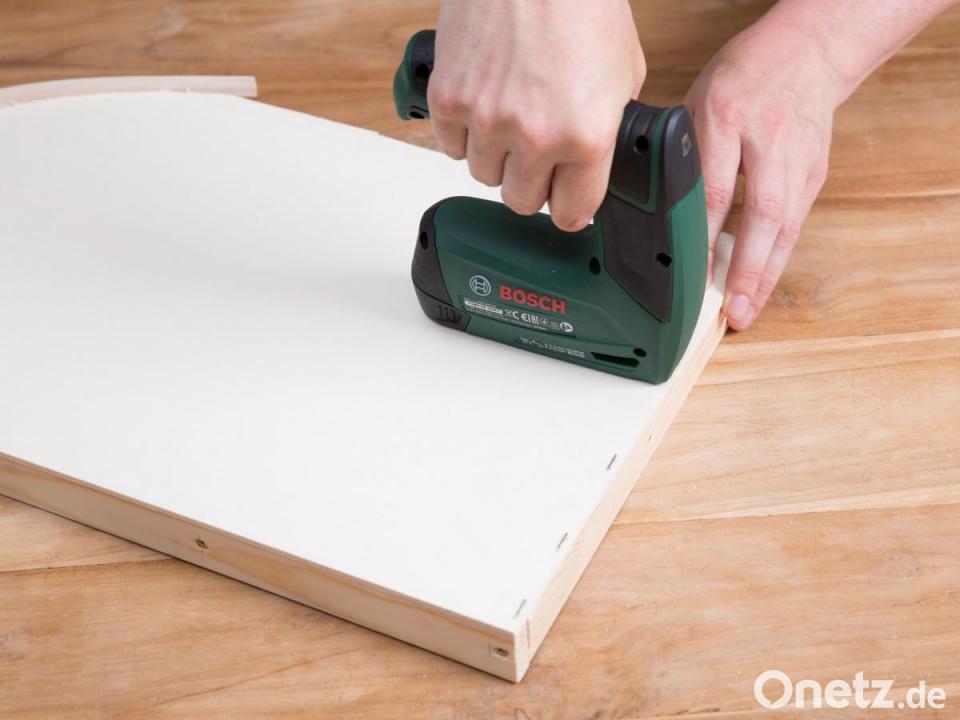 Das zugeschnittene Furnier am Rahmen festtackern. Um Wellen zu vermeiden, das Furnier erst auf einer Seite, dann oben, dann auf der gegenüberliegenden Seite befestigen.