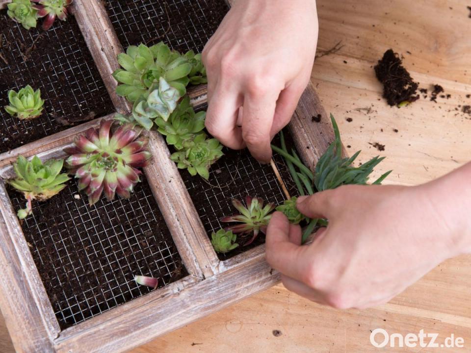 Schritt 10 - Bild bepflanzen: Jetzt kann das Deko-Fenster von oben mit Erde befüllt werden. Ein Löffelstiel eignet sich gut, um die Erde durch den Hasendraht zu drücken. Bevor die Sukkulenten eingepflanzt werden können, müssen deren Wurzeln behutsam freigelegt werden. Diese anschließend mit einem Holzspieß durch den Hasendraht führen. Damit die Pflanzen auch nach dem Aufhängen des Rahmens in ihrer Position bleiben, sollte das Fenster etwa zwei Wochen lang liegen, damit die Pflanzen anwachsen können.