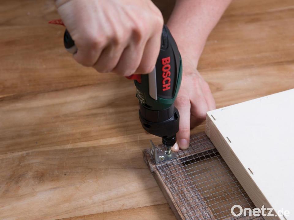 Schritt 9 - Rückwand und Fenster verbinden: Dann vier Metallwinkel in den Rahmenecken über dem Draht verschrauben. Die Unterkonstruktion mit der Rückwand nach oben zeigend auflegen und mit den Winkeln verbinden. Soll das Pflanzenbild später an einer Wand aufgehängt werden, können jetzt schon zwei Flachverbinder mit einer größeren Aufhänge-Öffnung oben und unten an der Rückwand befestigt werden.