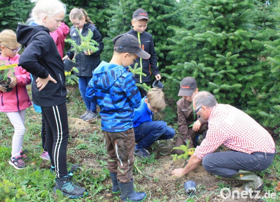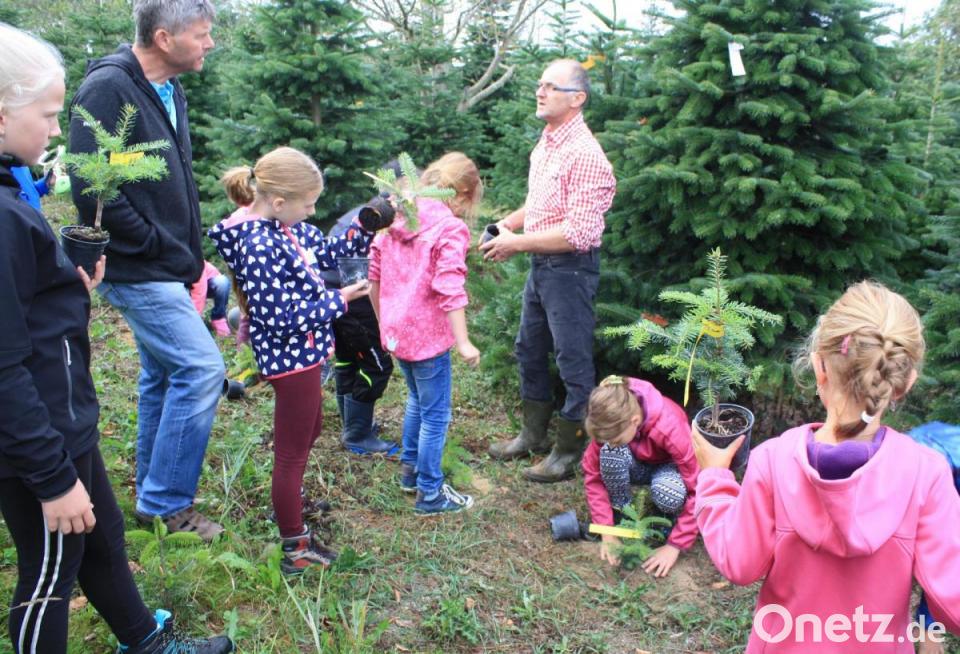 Zum Pflanzen von Nachwuchsbäumchen bohrte Lorenz Schön mit einem Bohrgerät zunächst Löcher in den Boden. Anschließend wurden die Baumpflanzen in den Boden eingesetzt, wo sie sich weiter entwickeln und wachsen können. Hierzu erklärte Lorenz Schön dass jeder Baum zehn Jahre Wachstum braucht, ehe er als Christbaum gefällt werden kann.