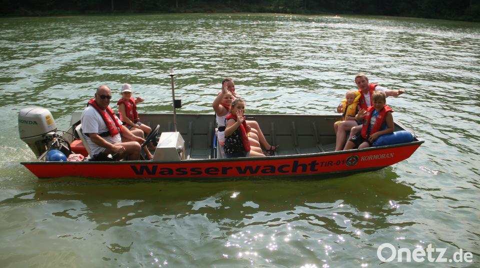 Zu dem Vergnügen haben sich wieder mehr als 30 Buben und Mädchen angemeldet. Auf das Anlegen der Schwimmweste aber wurde penibel geachtet und war Pflicht bei der großen Rundreise über den Baggersee mit seinen Tiefen. Der Motor war bereits gestartet, dann konnte die Zickzack-Fahrt, hin und her aber auch im Kreis losgehen. Mehrere Runden schoss man über den tiefen See dahin. Dann wurden die Passagiere gewechselt, später auch die Bootsführer und Begleiter. Für Sicherheit im Schnellboot, aber auch draußen am Steg, sorgten die ausgebildeten Rettungsschwimmer der Wiesauer Wasserwacht. Am Ende gab es eine stärkende Brotzeit.