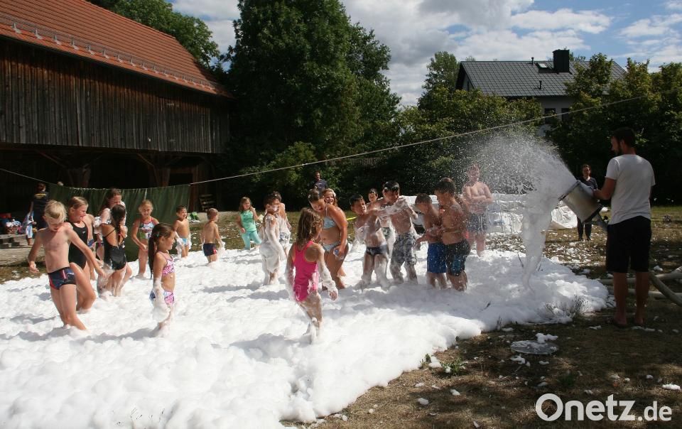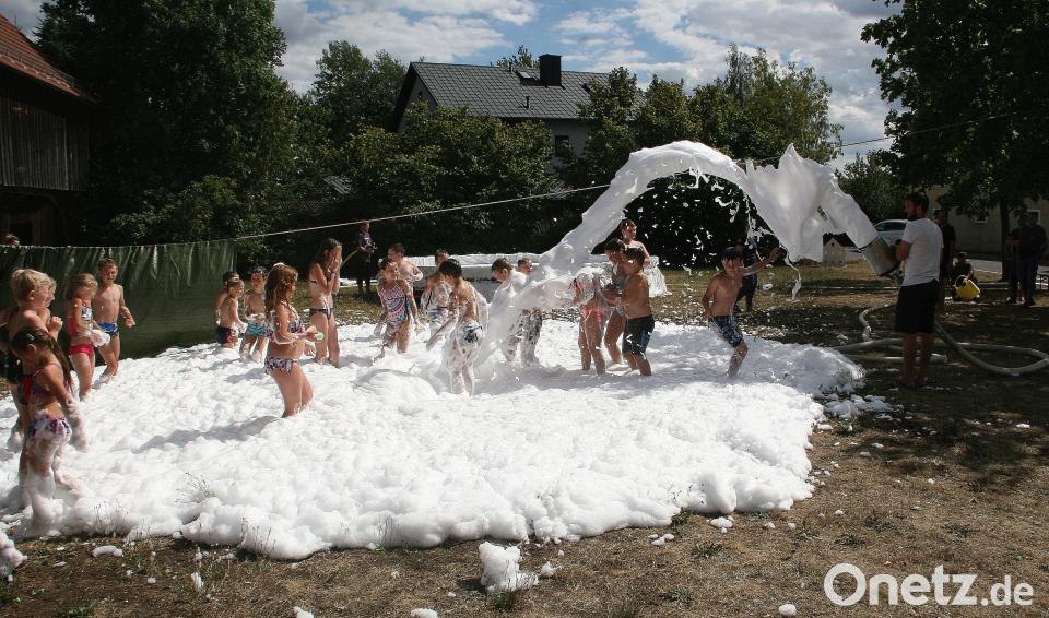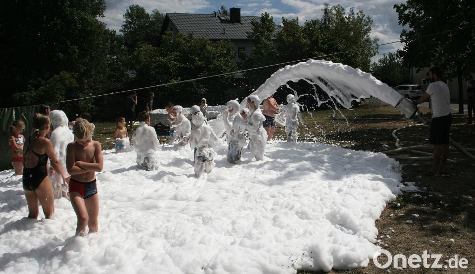 (wro) Damit der cremige Schaumberg nicht kleiner wurde, füllten die Aktiven immer wieder nach. Das daneben aufgebaute Schwimmbecken sorgte für eine willkommene Abwechslung im Kampf gegen die weißen Flocken, die am Schönhaider Dorfplatz beim Stadel überall herumwirbelten. Den Autoverkehr hatte man vorsorglich gleich ausgesperrt. Während die Kleinen noch im „Plansch- und Bademodus“ verweilten, wurde der Gartengrill angeworfen. Nicht nur die Kinder und die Helfer von der Feuerwehr, auch die Zaungäste hatten beim Badetag mitten im Dorf ihren Spaß.