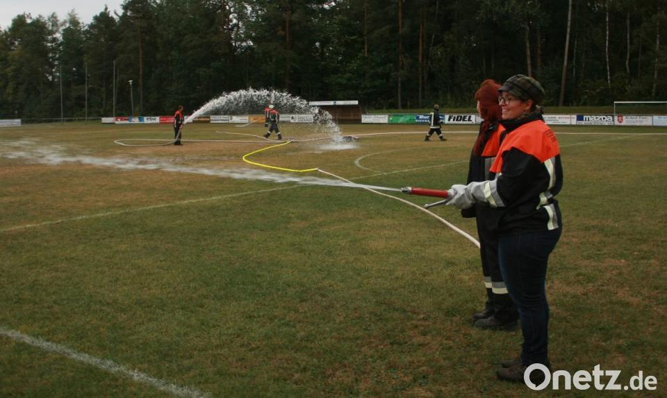 Ohne Sondersignal rückten zwei Einsatzfahrzeuge aus. Erstes Ziel waren die nahe gelegenen Waldseen, von wo aus eine überlange Schlauchleitung an den Sportplatz verlegt wurde, um das braun gewordene Grün mehr als eine Stunde lang ausgiebig zu bewässern. Ob der gut gemeinte Wasser-Einsatz der Feuerwehr, der auch von den weiblichen Brandschützern unterstützt wurde, gerade noch rechtzeitig kam, wird sich in den kommenden Tagen beweisen müssen. Und natürlich hilft der Regen, der übers Wochenende einsetzte.