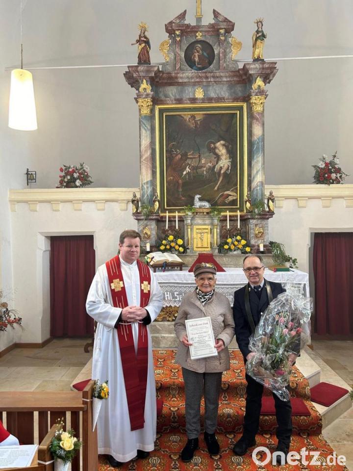 Zusammen mit Joseph Mauerer als Ortsvertreter der Kirchenstiftung überreichte Pfarrer Kraus ein Dankpräsent und eine Urkunde. Die Gottesdienstgemeinde spendete dankbaren Applaus.