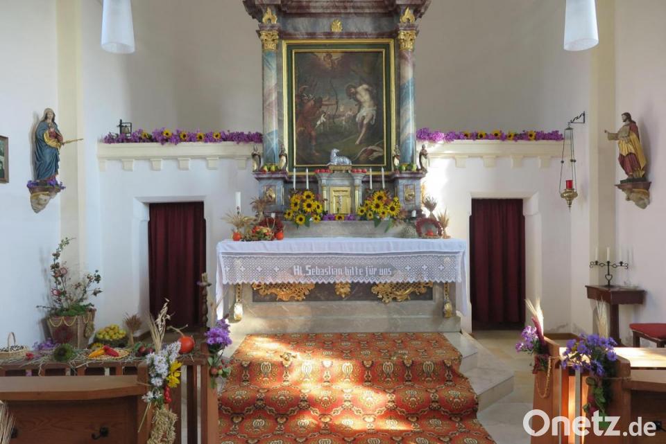 Gleich zwei Erntedankaltäre hat Mesnerin Barbara Dötterl in der Filialkirche St. Sebastian wunderbar gestaltet, einen großen und einen kleinen. Die Gläubigen, die die Messe zum Erntedank besuchten, bewunderten die vielen Gaben aus den Feldern und Gärten, die die Mesnerin dafür verwendet hat. Viel Kreativität bewies sie auch beim Schmücken der Kirchenbänke mit Herbstblumen und des Altars mit Sonnenblumen. Das Altarbild zeigt das Martyrium des heiligen Sebastian in eindrucksvoller Weise. Monsignore Martin Neumeier, die Messe zelebrierte, sagte Dötterl "Vergelt's Gott" für die wunderbare Gestaltung des Erntedankaltars. Seit 23 Jahren kümmert sie sich schon in liebevoller Weise um die Filialkirche. Nach dem Gottesdienst verweilten mehrere Pfarrangehörige noch eine Weile vor dem großen Erntedankaltar und ließen ihn auf sich wirken.
