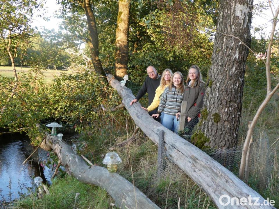 Am Keckenweiher-Südufer ist es nur ein langer filigraner Ast, der vom Ufer aus wie eine hölzerne Angelrute mit Fingern statt Haken ins Wasser ragt. Erheblich dicker sind die über dem Bach liegenden Baumstämme in der Ascha-Aue oberhalb des Festplatzes. Den Ort muss man erst mal finden. Um hinzukommen geht es durch sumpfiges Gelände, doch die Installation mit Pilzen aus Glasschalen vom Flohmarkt von drei Studentinnen aus Frankreich, die derzeit in Weihenstephan ihr Erasmus-Auslandstudium absolvieren, ist der Weg durch den Matsch wert.
