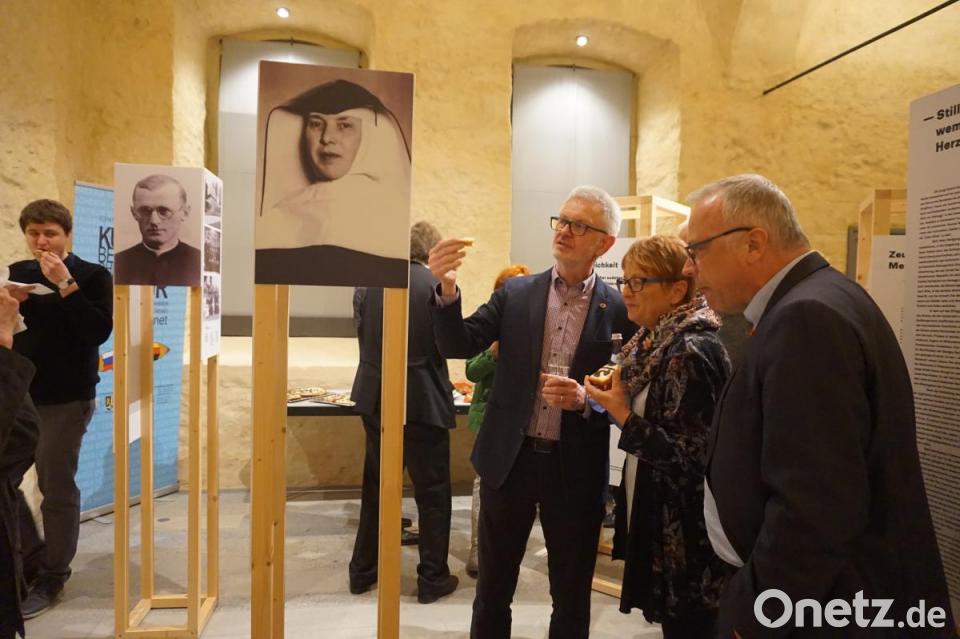 Der Ausstellungsrundgang beginnt in der historischen Gewölbehalle mit der in Verantwortung der Ackermann-Gemeinde entstandenen Präsentation „Zeugen der Menschlichkeit“. Geschäftsführer Matthias Dörr fasste bei der Eröffnung die Intention zusammen: „Wir wollten Impulse setzen und Vorbilder im Glauben zeigen. Porträts auf Augenhöhe“. Die schlicht, doch sehr markant im Raum stehenden Tafeln wirken wie Seiten in einem Geschichtsbuch, gehalten von zwei Buchdeckeln mit Titel und Erläuterungen zum Kontext.