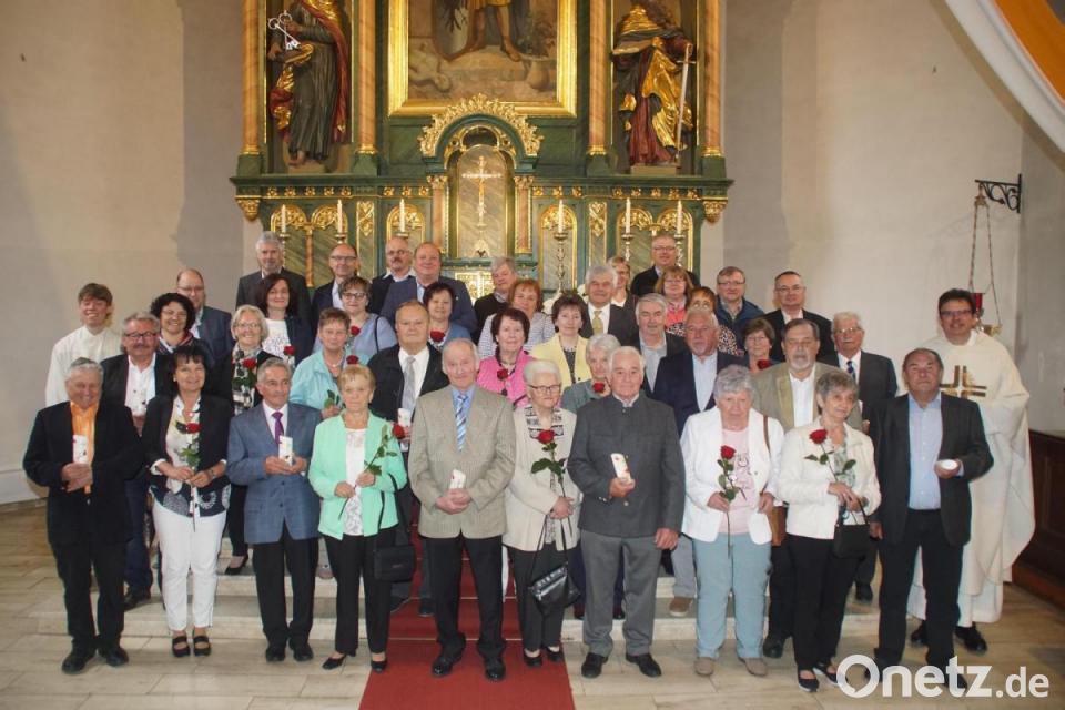 Gerade in schweren Zeiten, so der Priester, blieb stets auch das Angebot in das Gotteshaus zu kommen wo der Bund der Brautleute gesegnet wurde. Wenn junge Menschen fragen würden, wie sie schwierige Situationen gemeistert haben, könnten sie auf die Worte “Bete und arbeite” verweisen. Arbeit und Erfolg würden nur Segen bringen, wenn sie auf dem Vertrauen von Gott mitgetragen werden. Wenn im Alter Wege schwieriger werden, dürfe man sich erinnern, das Schmetterlinge seit alters her und in allen Völkern Symbol für die Auferstehung seien. Wenn Raupen sich mühselig verpuppen vollzieht sich das Wunder der Verwandlung, das allen vor Augen führe, dass der Auferstandene auch die Menschen aus dem Raupendasein erretten könne, betonte Pfarrer Dietz in seiner Festpredigt. Zum Abschluss wurde den Frauen eine Rose und den Männern eine Kerze überreicht.