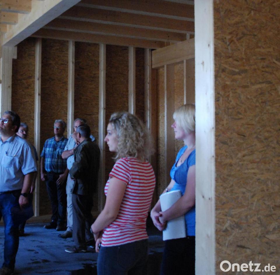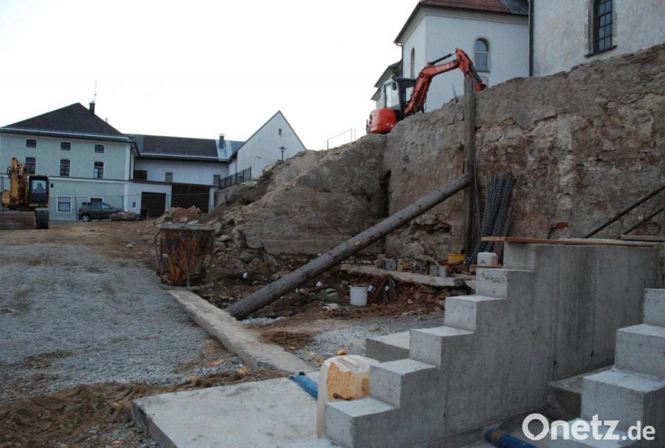 Interessante Einblicke gab es beim Kindergarten-Neubau. Hier hatten sich auch Pfarrer Wolfgang Dietz, Kirchenpfleger Peter Scharnagl und die beiden Leiterinnen eingefunden. Der vorgefertigte Holzbau (45 Meter lang) für den dreigruppigen Kindergarten steht. Besonders überraschte, dass alle Rohre, Abflüsse und Steckdosen-Aussparungen bereits vorhanden sind. Lob gab es für die Deckenkonstruktionen im Mehrzweckraum und Speisesaal. Der Einzug wird für das Frühjahr 2020 anvisiert. Auch in der Hauptstraße 2 tut sich nach dem Abriss der alten Schule endlich etwas. Die Platzgestaltung mit neuer Mauer soll bis Ende des Jahres fertiggestellt sein. Die untersten Stufen für den Aufgang zum Kirchenplatz sind betoniert. Architekt Schönberger erläuterte das künftige Höhenniveau des Platzes mit leichter Neigung zur Staatsstraße hin sowie die Ausführung der Bruchsteinmauer.