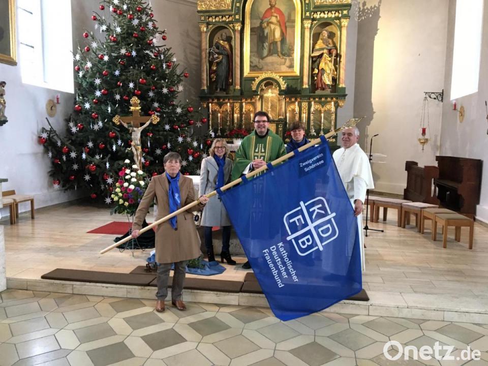 Pater Jakob Seitz, der Geistliche Diözesanbeirat des Frauenbundes, zusammen mit Pfarrer Wolfgang Dietz, Geistlicher Beirat des Zweigvereins Schönsee, am Sonntag in der Pfarrkirche den Gottesdienst zum Gründungsfest des Frauenbundes Schönsee feiert, wird ein besonderer Akt vorgenommen. Die Segnung der neuen Fahne.