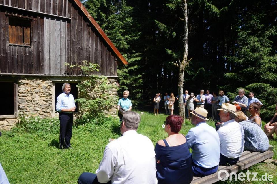 Die Veranstaltungsregie setzte nach den Grußworten und dem Bilanzbericht des heuer auslaufenden dreijährigen Projekts „Oberpfalz und Region Pilsen. Gemeinsam in der Mitte Europas“ mit der Exkursion zur Bügellohe bewusst ein Zeichen der Versöhnung. Vor dem einzigen noch erhaltenen der ehemals elf Häuser auf der Bügellohe schlüpfte Maria Hammerer in die Rolle der vierfachen Mutter Maria Wachter, die nach der Vertreibung sieben Jahre auf der Bügellohe lebte. Ihre bewegende Lebensgeschichte zeichnet die Lebensumstände jener 59 Vertriebenen aus Wenzelsdorf nach, die zunächst in primitiven Holzhütten lebten – damals noch in der Erwartung, bald zurückkehren zu können.
