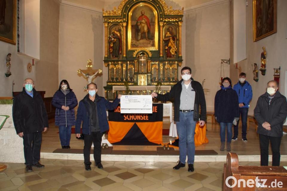 Wegen der aktuellen Corona-Beschränkungen entfiel das nach dem Gottesdienst übliche gesellige Beisammensein. Die ursprünglich dort geplante Spendenübergabe für die Renovierung der Pfarrkirche nahmen Vorsitzender Hans Herrmann und weitere Vorstandsmitglieder im Gotteshaus vor. Sie überreichten Pfarrer Wolfgang Dietz einen symbolischen Scheck über 2000 Euro.