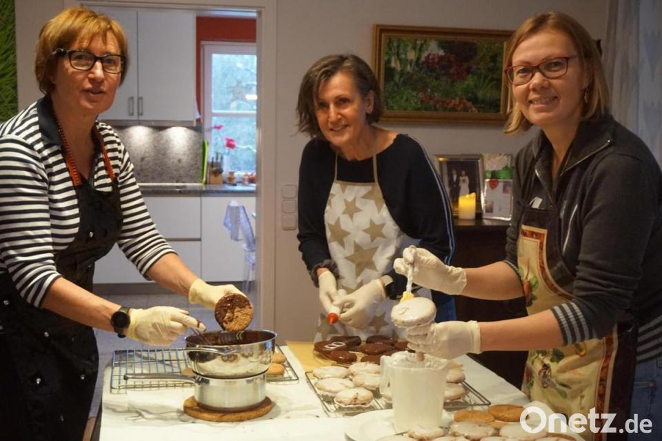 Der Duft frischgebackener Lebkuchen durchzieht Küche und Esszimmer bei Anne Gierlach (links) in Winklarn. Die "Lebkuchenmanufaktur" bei der früheren Vorsitzenden des Trägervereins des Centrums Bavaria Bohemia (CeBB) läuft auch nach ihrem Abschied noch jedes Jahr in der Vorweihnachtszeit auf Hochtouren. Die Adventsbackstube hat Tradition seit dem ersten "Advent im Wald" am Eulenberg. Seitdem bessern die Erlöse aus dem Verkauf von Anne Gierlachs Lebkuchen und Lucia Eibauers Bratäpfeln das Spendenkonto des Vereins "Bavaria Bohemia" auf. Helfend dabei sind dritte Vorsitzende Gabi Dlubal (rechts) und die Schriftführerin des Vereins, Kamila Spichtinger (Mitte). Um die hundert helle und mit dunkler Schokolade glasierte Elisen-Lebkuchen wurden für das Dankeschön-Treffen am kommenden Sonntag vorbereitet.