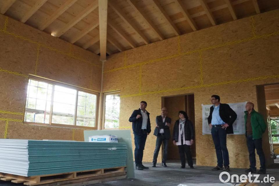"Die Stadt ist froh über die gute Zusammenarbeit", betont Bürgermeisterin Birgit Höcherl beim Pressetermin mit Oberpfalz-Medien auf der Baustelle und rechnet infolgedessen auch mit einem guten Endergebnis. Architekt Christian Schönberger skizziert, was hier schon erste Formen annimmt: "Fast zu 100 Prozent nachhaltig" werde hier ein Holzbau erstellt, mit Holzfenstern und Holzheizung. Während bei konventionellen Gebäuden oft Schadstoffe arge Probleme bereiten würden, sei man hier auf der sicheren Seite. Auch das Klima hatten die Planer im Blick: Ein Gründach soll das vom Friedhof her einsehbare Gebäude nicht nur optisch aufwerten, sondern auch einer Aufheizung der Räume im Sommer vorbeugen. "Dieses leicht geneigte Dach kann bis zu 50 Liter Regenwasser pro Quadratmeter speichern, dadurch wird es dort oben nicht heißer als 40 Grad", informiert der Architekt. Oberlichter, die sich nachts öffnen, natürlich mit Insektenschutz, sowie eine generelle Be- und Entlüftung verringern nach Kalkulationen des Fachmanns künftig den Energieverbrauch. Geheizt wird im Übrigen mit Pellets.