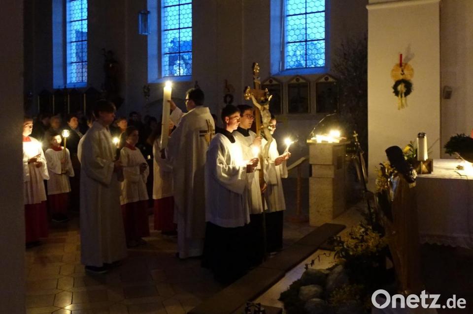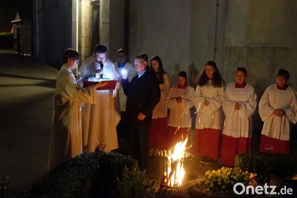 Bei der Segnung des Osterfeuers vor der Osternachtsliturgie, der größten Feier im Jahreskreis, bezeichnete Pfarrer Wolfgang Dietz diese besondere Nacht als ein "Zeichen der vielen Nächte, die wir aus eigener Erfahrung kennen: Nächte der Verlassenheit und Trübsal, der Angst, der Einsamkeit, der Lieblosigkeit und die Nacht des bitteren Todes". In dieses Dunkel leuchte aber das österliche Feuer, an dem die Osterkerze entzündet wird. Dies bedeute, dass der auferstandene Jesus, das Licht der Welt, auch in unserer Dunkelheit leuchte. Mit dem Entzünden des Feuers werde den Menschen der Wunsch nach Hoffnung, Freude und ein Zusammenleben in Frieden gegeben. Hell und kraftvoll wie das Feuer, so der Geistliche, möge die Hoffnung in das Leben strahlen und die Finsternis der Welt vertreiben.