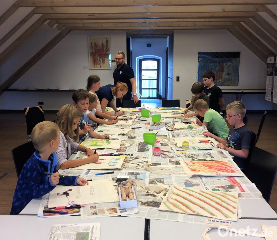Erster Spielort war im CeBB, dann ging es auf den Platz vor dem Haus. Los ging es im Raum bb-dialog mit einer kleinen Sprachlektion. Die Kinder durften sich ein Lieblingstier aussuchen und dazu das tschechische Worte lernen. Mit dem Miniwortschatz ging es an das Bemalen und Bedrucken von Jutetaschen. Die beiden Seiten der Taschen boten viel Platz, um die Tierbegriffe und die verschiedenen Laute, die sich in den beiden Sprachen unterscheiden, aufzumalen. So gibt im Deutschen die Ziege (koza) ein „Bäh“ von sich, im Tschechischen aber ein „Mäh.“ Wie hierzulande die Schafe – verkehrte Welt.