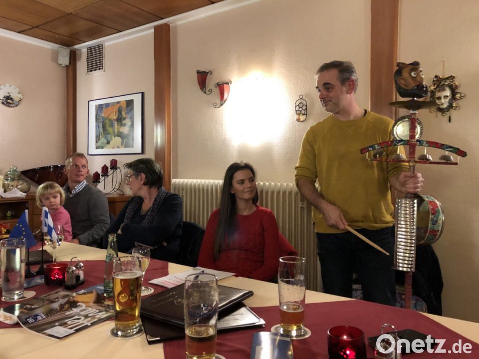 Kamil Jindřich gab den Stammtischgästen einen vereinfachte Selbstbauanleitung für eine böhmische Teufelsgeige mit an die Hand: Man nehme einen Stecken, einen Bügel, einen Topf, eine Backform für Kuchen, ein paar Glöckchen sowie Blech, das scheppert. Dazu noch als Hut einen geschnitzten Teufelskopf oder ein anderes mythisches Wesen, und fertig ist die „Vozembouch“, wie die "Stoußrumpl" im Böhmerwald genannt wird. (eib)