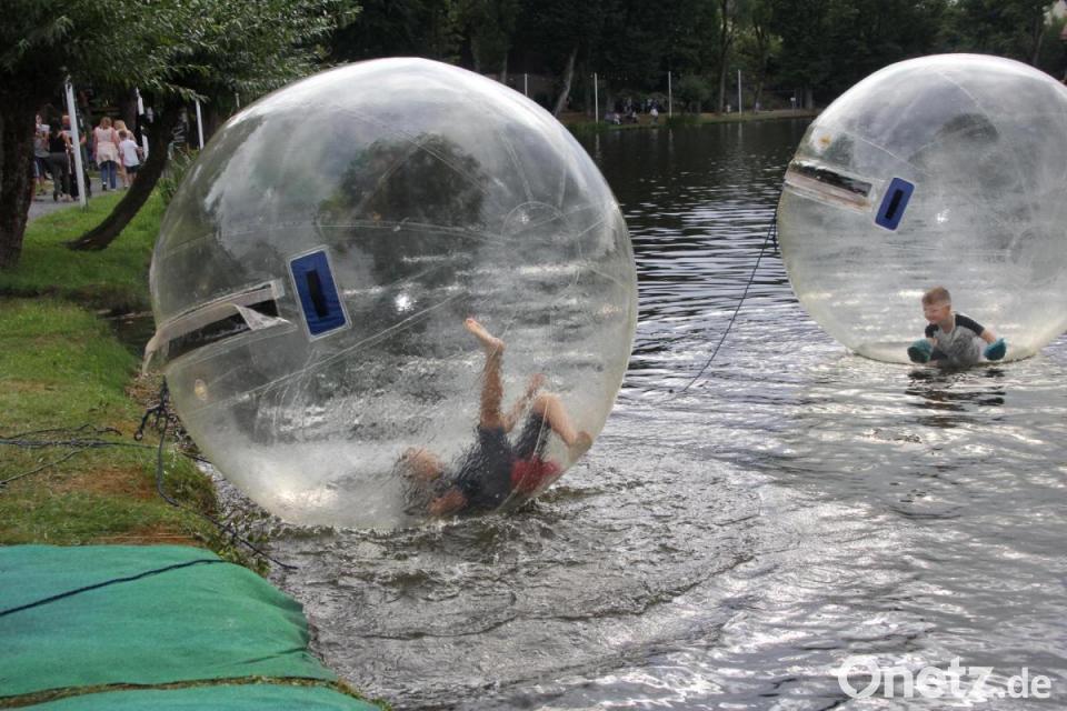 Im Lauf des Nachmittags füllten sich Tische, Bänke und Gänge. Die Kinder nutzten die angebotenen Attraktionen am See wie die Riesenwasserblase, Hüpfburg, Kinderkarussell und Kinderschminken oder ließen sich von den Soldaten der Patenkompanie mit dem Schlauchboot über den Hahnenweiher schippern.